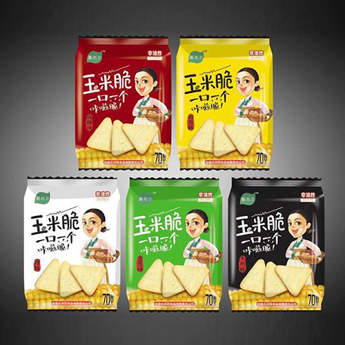 玉米脆片作為公司研發(fā)的新品之一,以原料純正、非油炸、無防腐劑等特點,上市即得到了消費者的一致好評。它具有酥脆綿甜、玉米味醇厚、色澤金黃等特點。 目前推出的系列單品共計15個。分別是:70g折角塑膜袋玉米脆片(麻辣味、香蔥味、原味、咖喱牛肉味、海苔味)、50g充氣袋裝玉米脆片(麻辣味、香蔥味、原味、咖喱牛肉味、海苔味)和20g充氣袋裝玉米脆片(麻辣味、香蔥味、原味、咖喱牛肉味、海苔味)